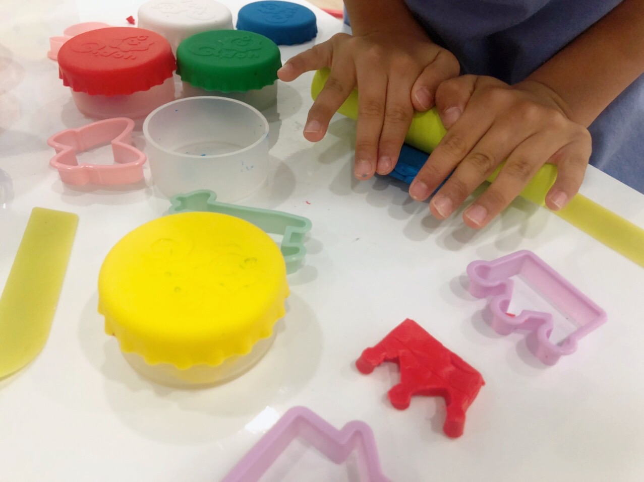 像是一起捏恐龍、用黏土把小動物包起來、用小車子在黏土上壓出痕跡…等