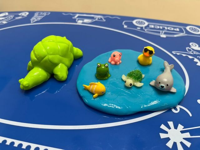 把藍色職能運動有機矽膠黏土壓扁扁,再上海洋動物小玩具,就是可愛繽紛的海洋世界