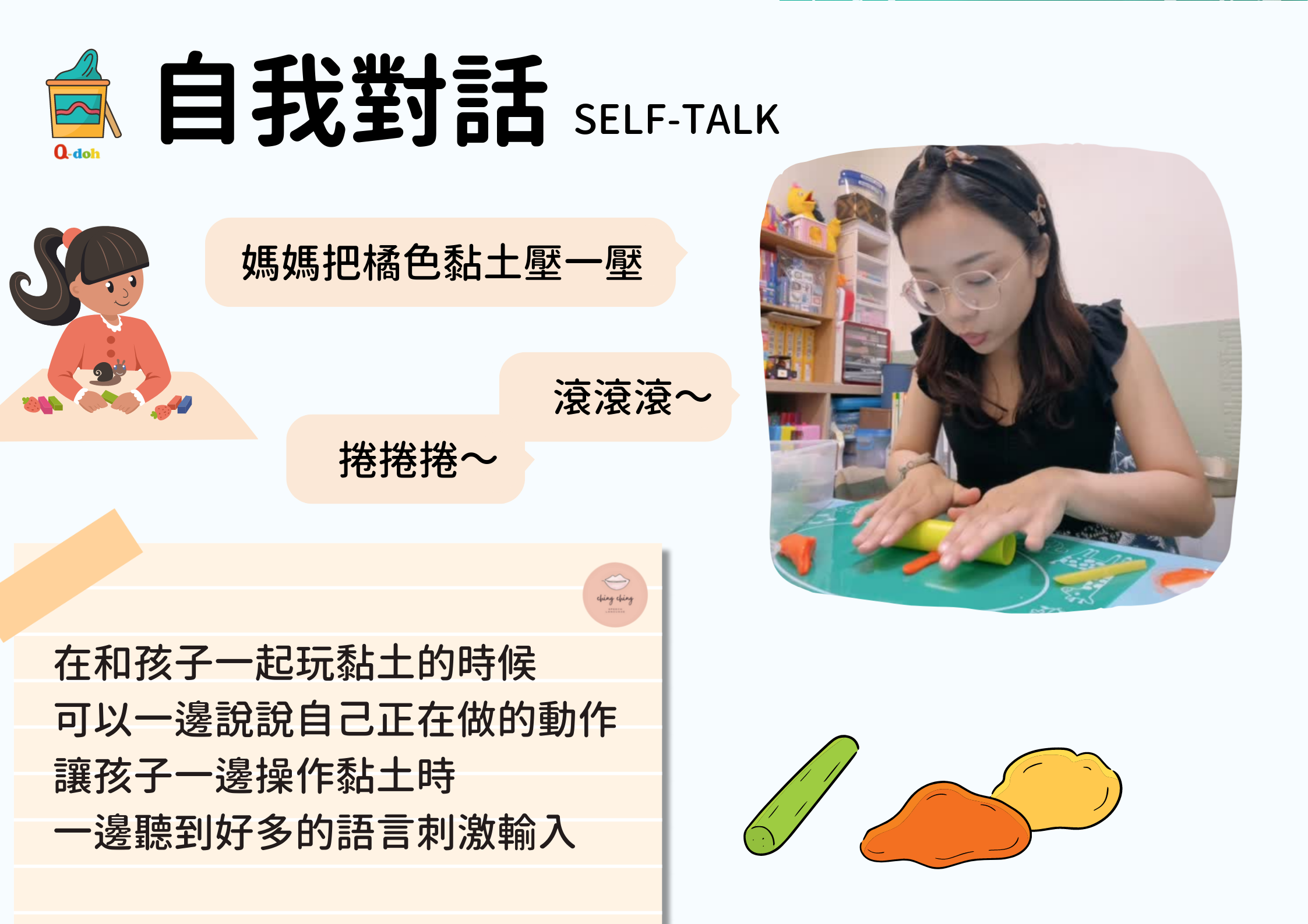 另外,靜靜老師也提供幾個小技巧給爸爸媽媽們,我們在和孩子一起玩黏土的時候,可以一邊說說自己正在做的動作,在治療上我們稱為「自我對話Self-talk」,像是你可以說:「媽咪把黃色的黏土放到桌上,然後壓一下!」然後觀察看看孩子會不會跟你做一樣的!