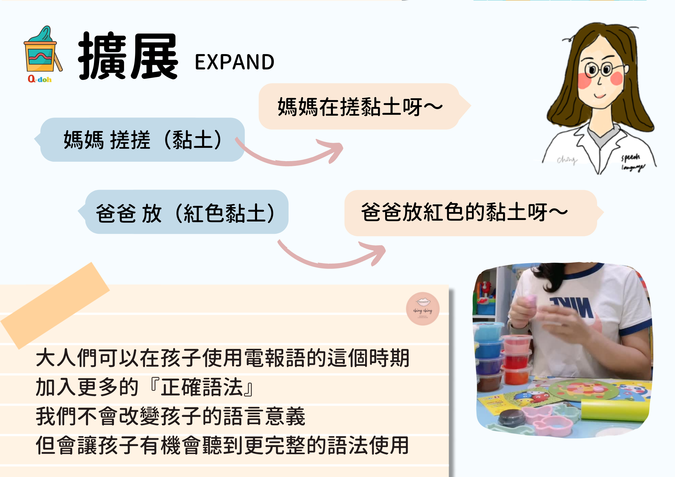 第三個也是操作上很容易上手的語言促進技巧就是「擴展Expand」,擴展顧名思義就是把原本的語言「擴大、延展」,小小孩在語言發展的過程中,時常會出現所謂的「電報語telegraphic speech」,像是「媽媽 捏捏、爸爸 切切」這種充滿實詞、沒什麼語法的口語,是多數孩子發展語言的必經之路,而大人們可以在孩子使用電報語的這個時期,加入更多的『正確語法』,我們不會改變孩子的語言意義,但會讓孩子有機會聽到更完整的語法使用,像是「媽媽捏黏土~爸爸切餅乾」。