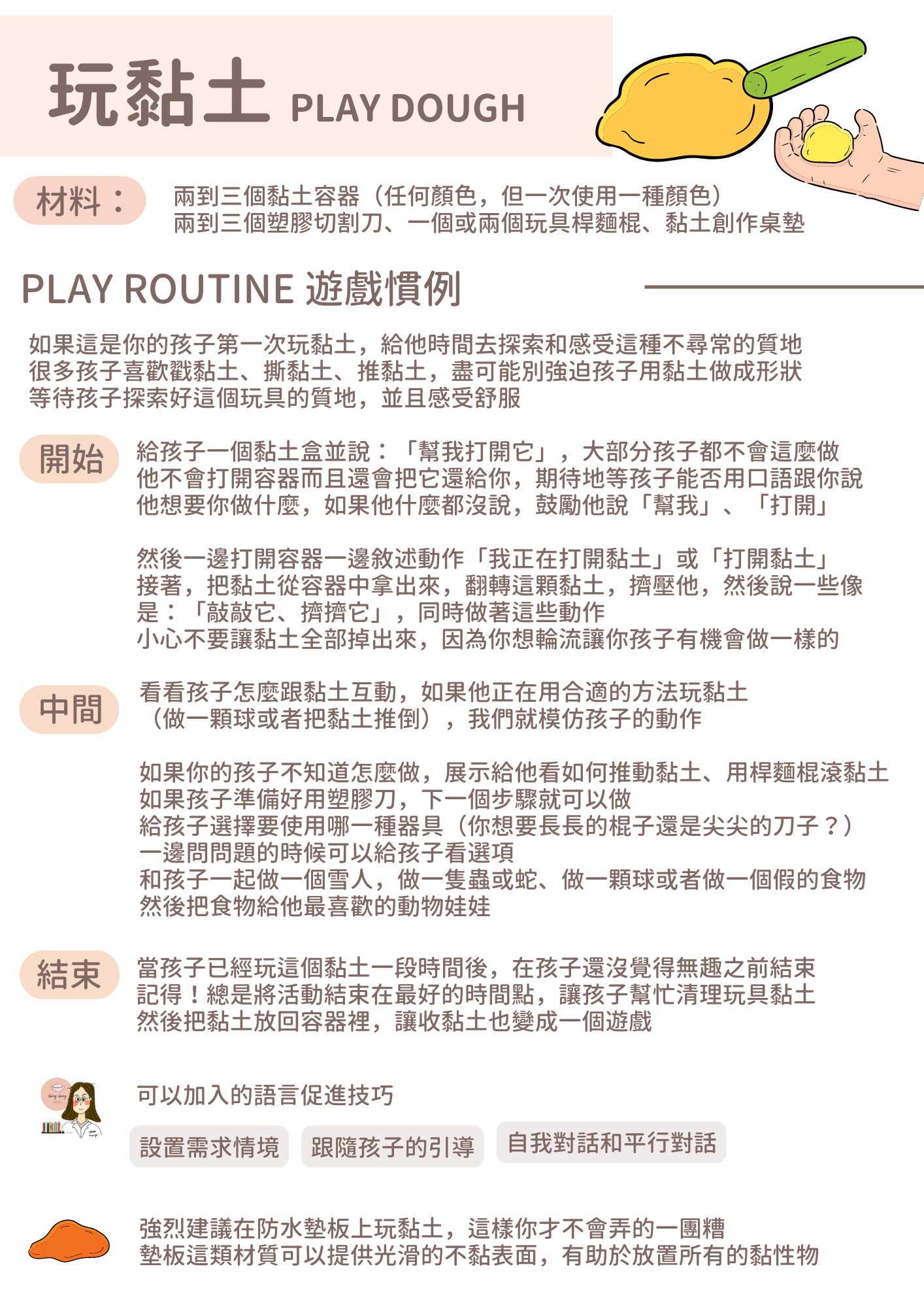 這個技巧可以讓孩子一邊操作黏土時,一邊聽到好多的語言輸入,也可以在無形中引導孩子多去觀察身旁的人,對於語言、人際發展上也都是很重要的!