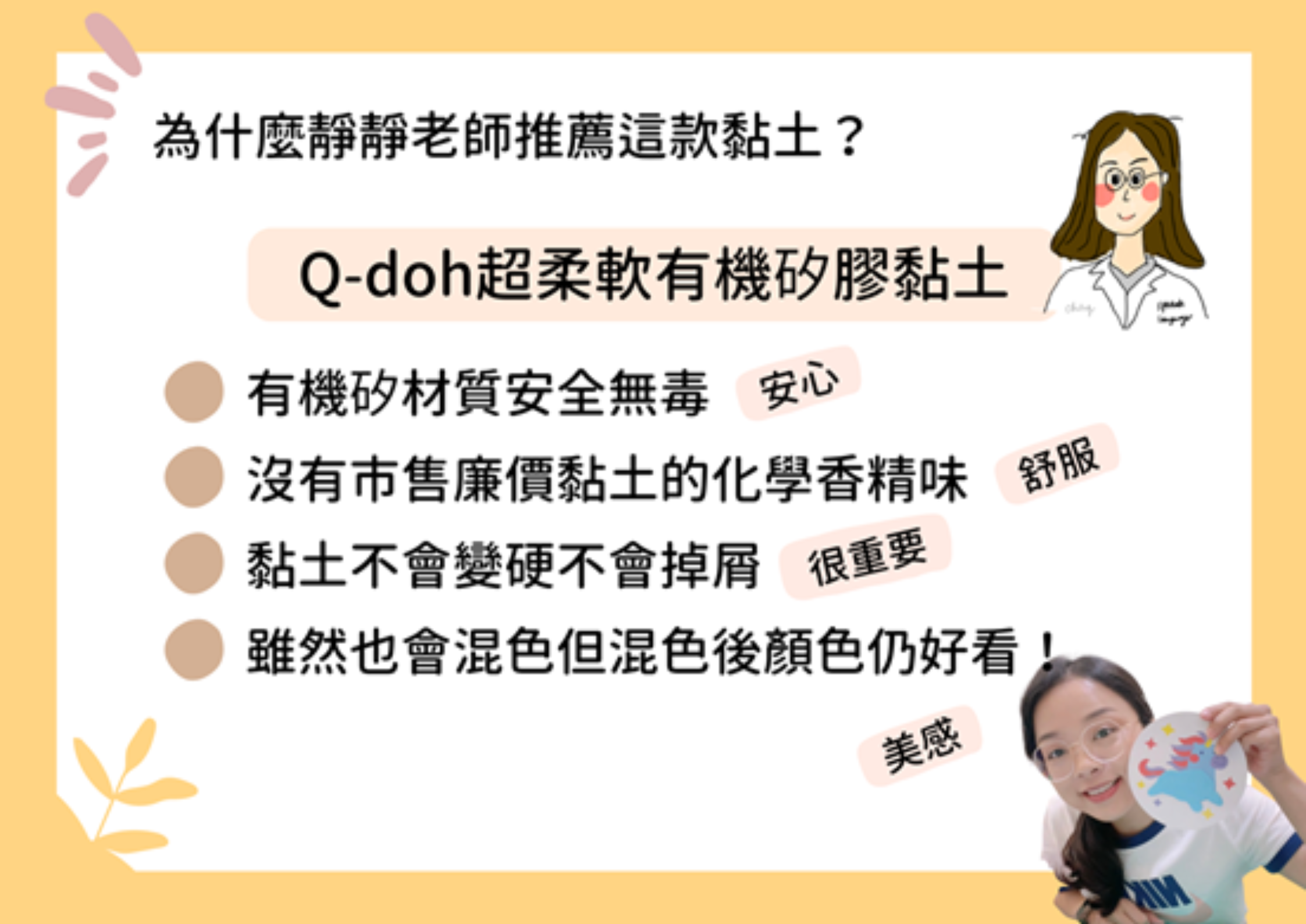今天要介紹的黏土是Q-doh官方獨家專利所開發,台灣製造的有機矽膠黏土,黏土的材質安全無毒,通過許多國際安全檢驗,也沒有市售廉價黏土的那種化學香精味,這可是靜靜老師親自試用之後最真實的心得感想,最重要的是黏土不會變硬啊!!!!!!~~~~