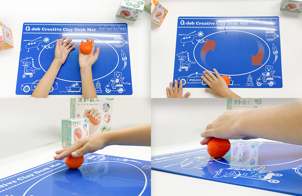 步驟2. 掌心朝下,延著黏土創作板上的橢圓線滾動黏土,直到黏土變圓為止