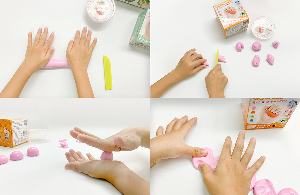 永不乾硬,可重複練習使用,延展性極佳,分別不同軟硬度,因此可依照幼童小手發展選擇不同軟硬度的黏土搭配有趣的黏土遊戲,增強小手肌力、手部發展、促覺刺激、手眼腦協調等感覺統合。